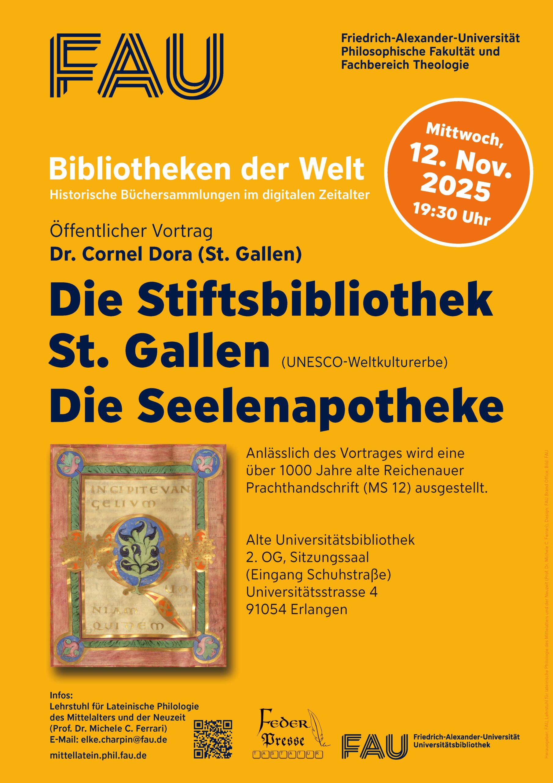 Neue Vortragsreihe FEDER PRESSE TASTATUR. BIBLIOTHEKEN DER WELT – Historische Büchersammlungen im digitalen Zeitalter: Cornel Dora, Die Stiftsbibliothek St. Gallen – Die Seelenapotheke, Erlangen, 12. Nov. 2025