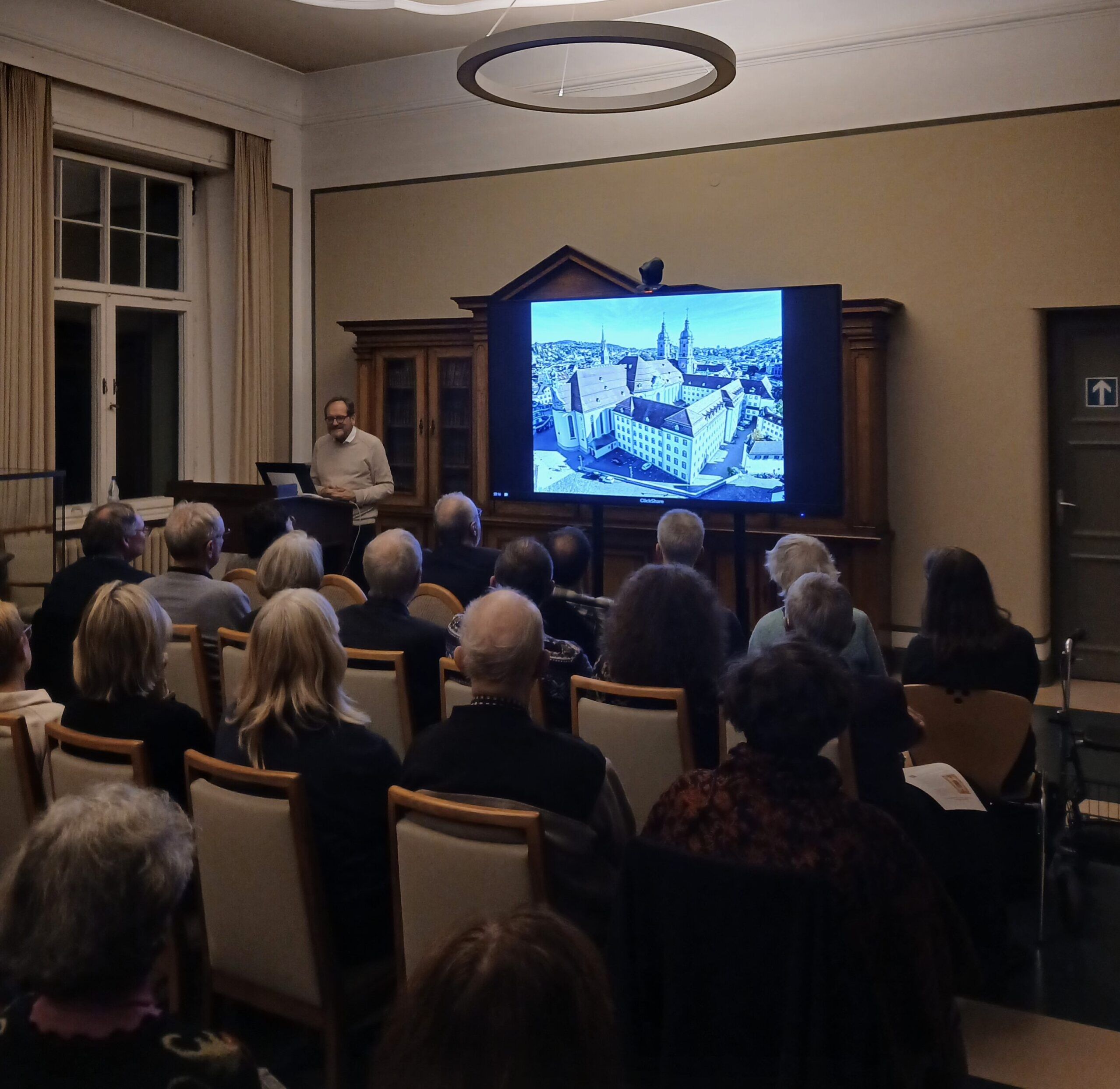 Voller Erfolg: Die vom Lehrstuhl für Lateinische Philologie des Mittelalters und der Neuzeit (Prof. Dr. Michele C. Ferrari) und der Universitätsbibliothek Erlangen-Nürnberg gemeinsam veranstaltete neue Vortragsreihe FEDER PRESSE TASTATUR. BIBLIOTHEKEN DER WELT – Historische Büchersammlungen im digitalen Zeitalter ist am 12. November bei ihrem ersten Vortrag (Cornel Dora, Die Stiftsbibliothek St. Gallen – Die Seelenapotheke) mit über 100 Gästen gestartet. Wir danken allen, die zu diesem Erfolg beigetragen haben, und freuen uns auf den nächsten Vortrag im November 2026.